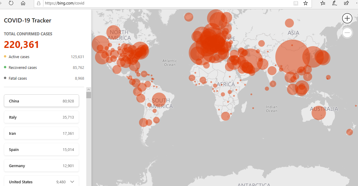 Bing has launched a COVID-19 tracker that displays the number of confirmed cases worldwide. The data is broken down into active, recovered and fatal cases, and can be filtered by geographic region, The Next Web first reported on Monday.